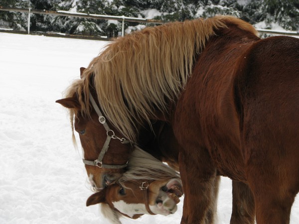 Tonyho respektují všichni koně v naší stáji, pokud je v jejich blízkosti „klidí“ se mu z cesty. Kontakt s ostatními koňmi většinou Tony nevyhledává, drží se stranou, málokdy se účastní potyček, občas se nechá zlákat Martinem nebo poníky ke společné hře. Velmi rád ve výběhu odpočívá v leže a to během všech ročních období.